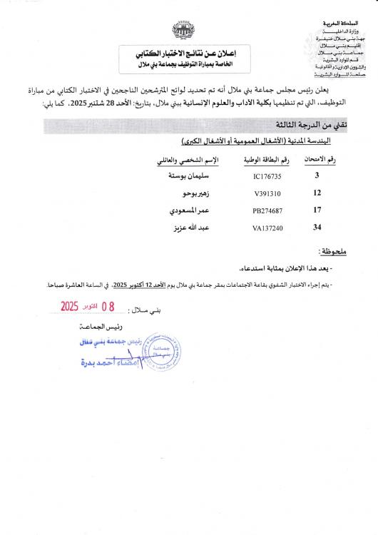 اعلان عن نتائج الاختبار الكتابي لمباراة التوظيف فئة تقني من الدرجة التالثة الهندسة المدنية بجماعة بني ملال