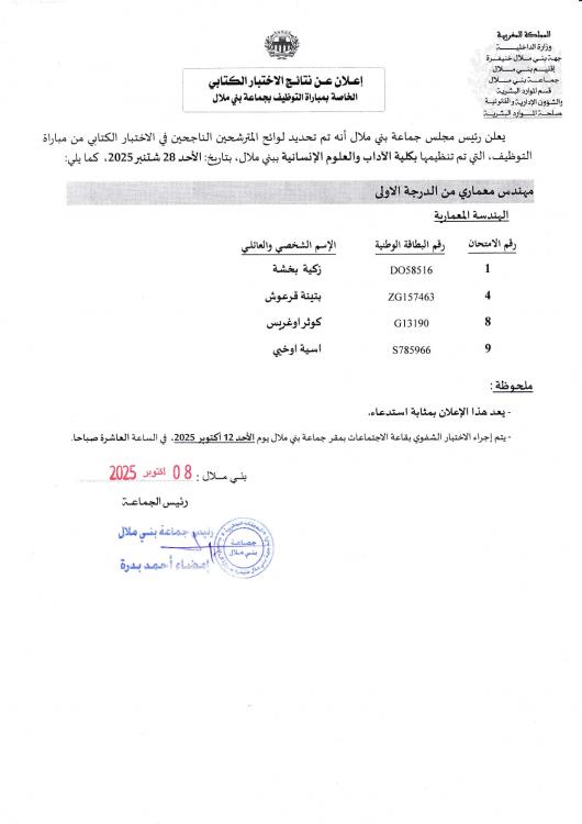 اعلان عن نتائج الاختبار الكتابي الخاص بماراة التوظيف فئة مهندس معماري من الدرجة الاولى بجماعة بني ملال