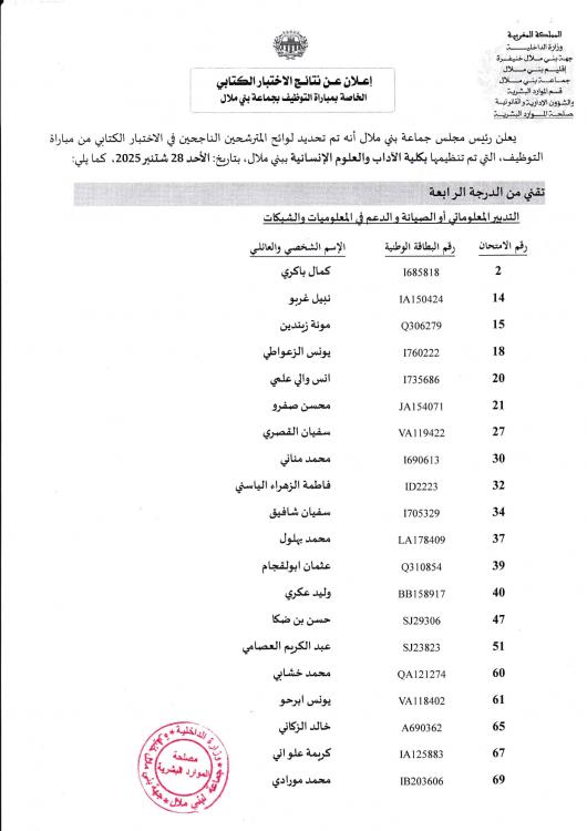 اعلان عن نتائج الاختبار الكتابي الخاص بماراة التوظيف فئة تقني الدرجة الرابعة بجماعة بني ملال