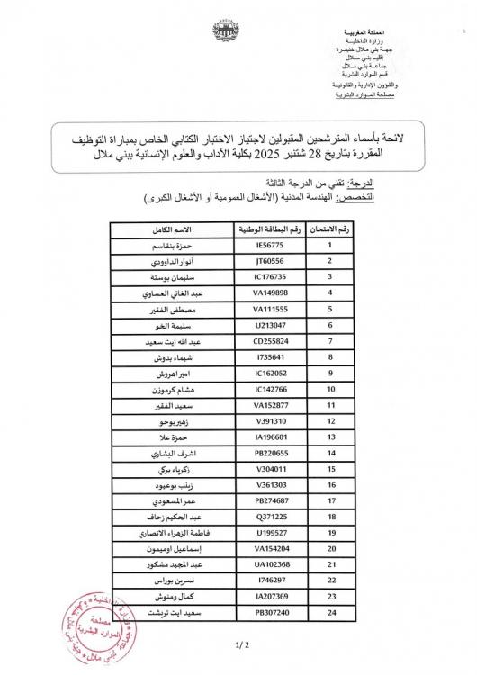 لائحة المترشحين المقبولين لاجتياز الاختبار الكتابي فئة تقني من الدرجة الثالتة الهندسة المدنية (الأشغال العمومية أو الأشغال الكبرى)
