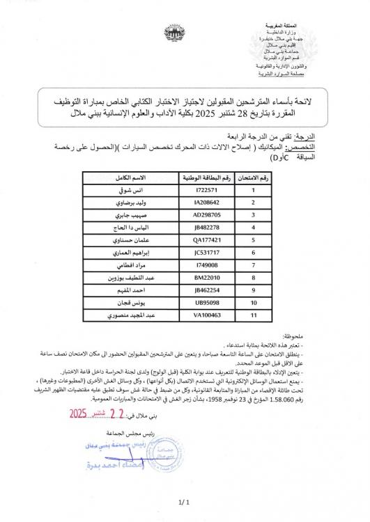 لائحة المترشحين المقبولين لاجتياز الاختبار الكتابي فئة تقني من الدرجة الرابعة كهرباء السيارات