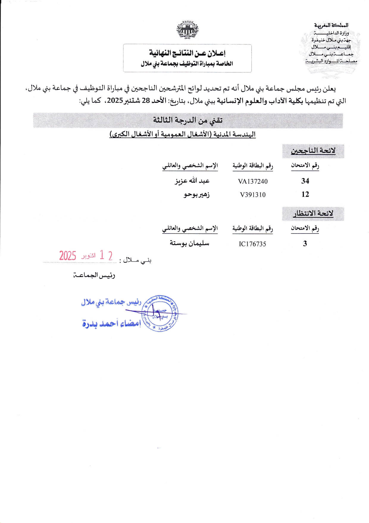 اعلان عن النتائج النهائية الخاصة بمباراة التوظيف فئة تقني من الدرجة التالثة الهندسة المدنية "الأشغال العمومية أو الأشغال الكبرى" بجماعة بني ملال
