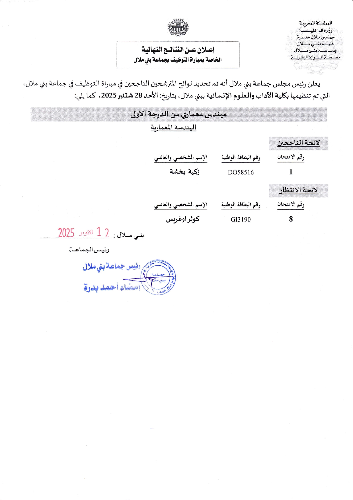 اعلان عن النتائج النهائية الخاصة بمباراة التوظيف فئة مهندس معماري من الدرجة الاولى بجماعة بني ملال