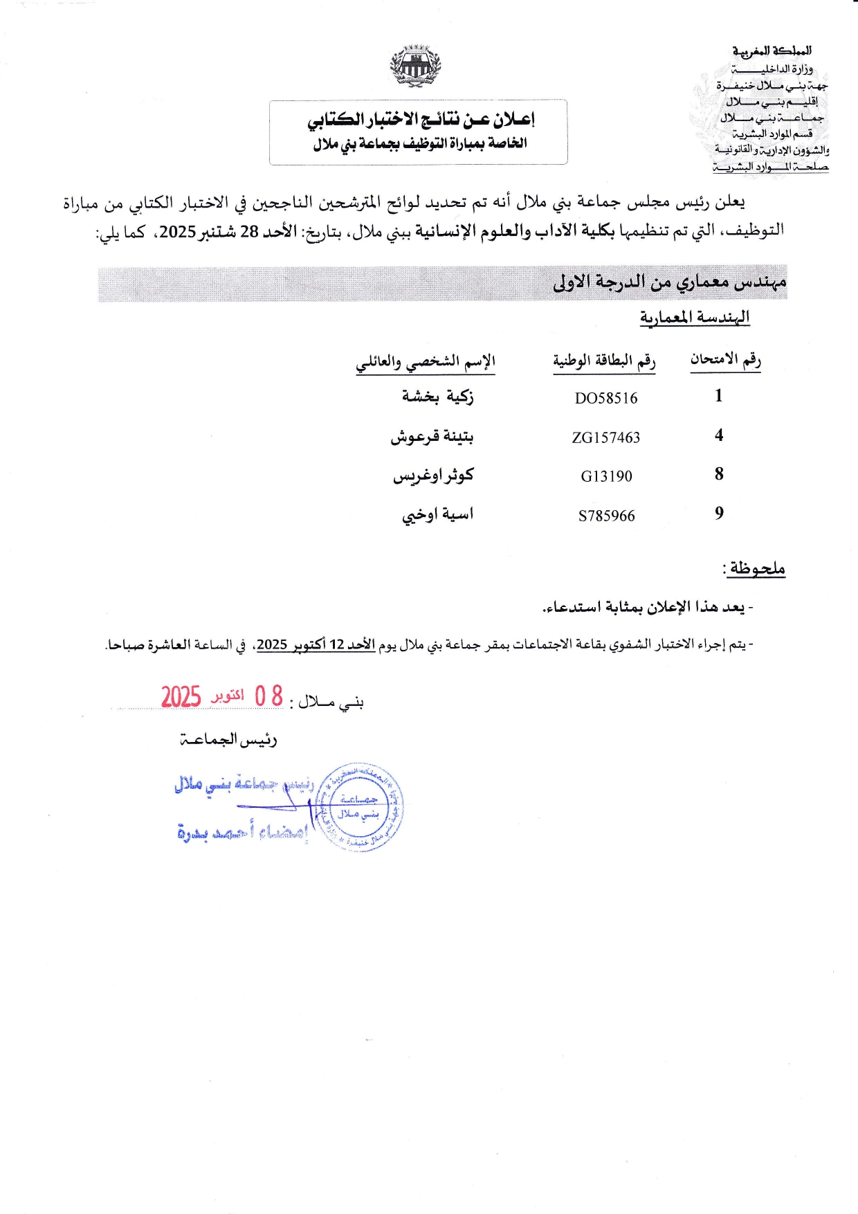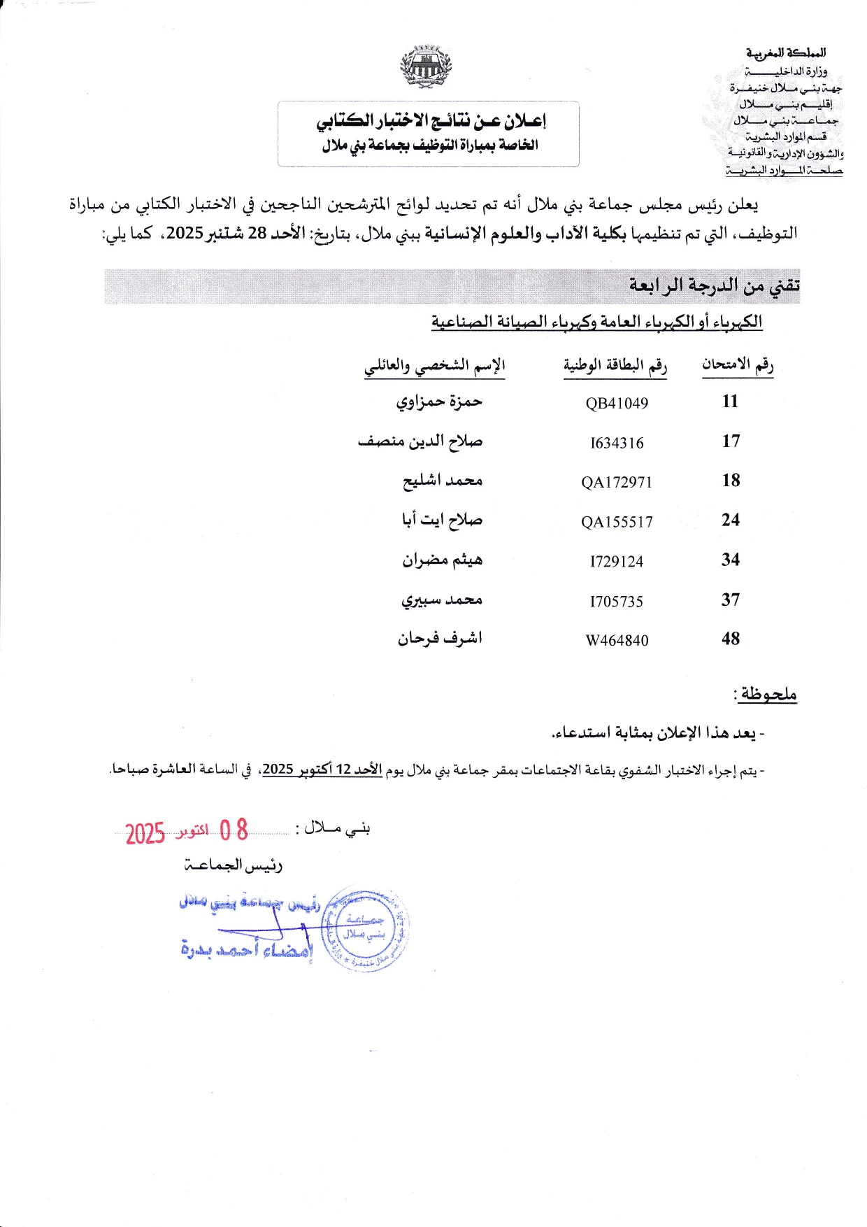 اعلان عن نتائج الاختبار الكتابي الخاص بماراة التوظيف فئة تقني الدرجة الرابعة بجماعة بني ملال