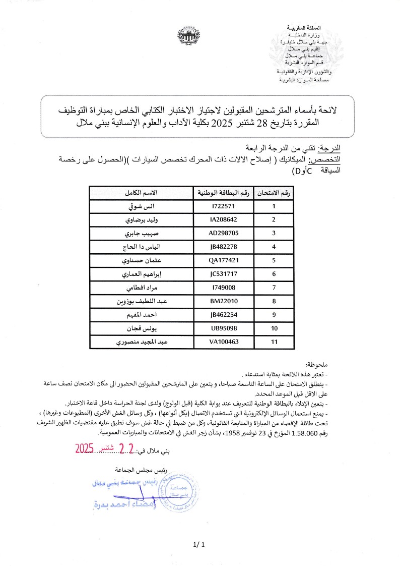 لائحة المترشحين المقبولين لاجتياز مباراة الاختبار الكتابي فئة تقني من الدرجة الرابعة الميكانيك (اصلاح الآلات ذات المحرك تخصص السيارات)