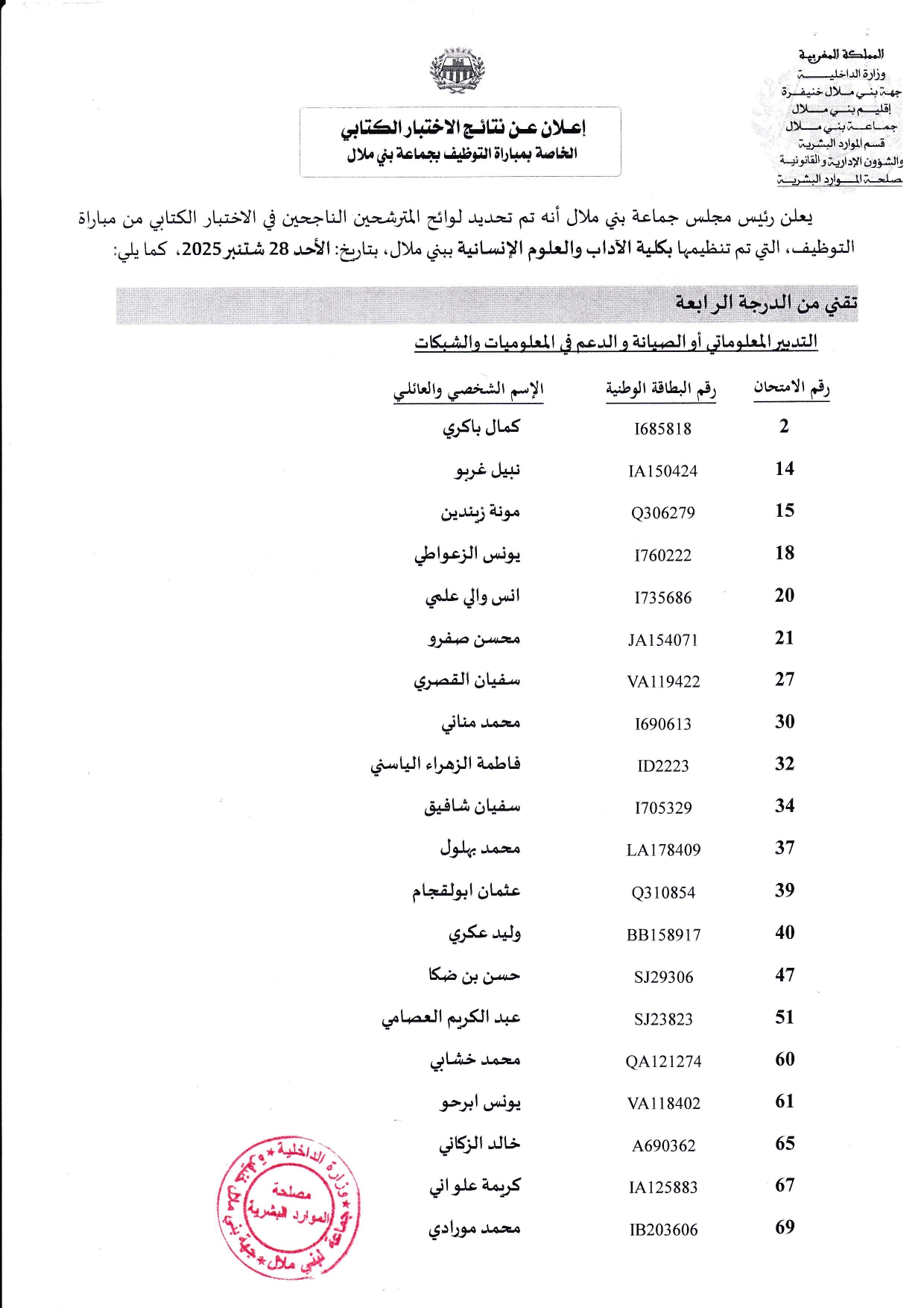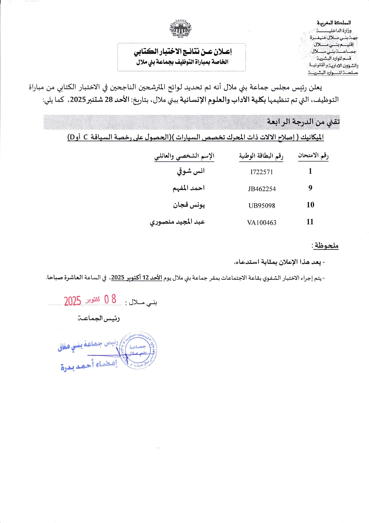 اعلان عن نتائج الاختبار الكتابي الخاص بماراة التوظيف فئة تقني الدرجة الرابعة بجماعة بني ملال